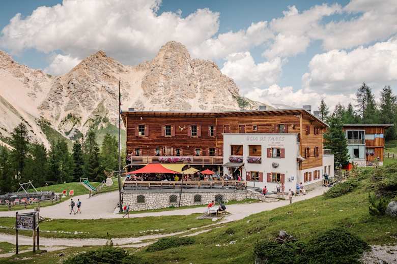 Die Faneshütte auf 2.060 m im Naturpark Fanes-Sennes-Prags liegt in der Kreuzkofelgruppe in den Südtiroler Dolomiten. Der Zustieg von Süden aus dem Valle di Cassiano führt im zweiten Abschnitt über den Dolomitenweg 1 zur Hütte.