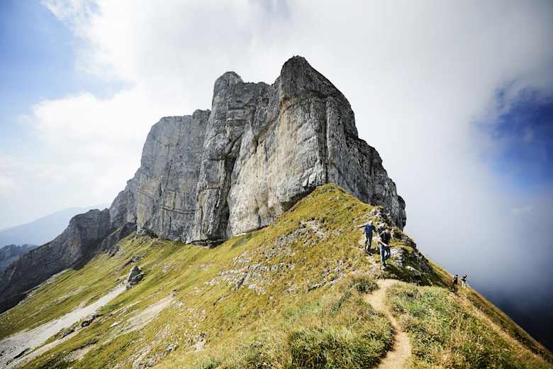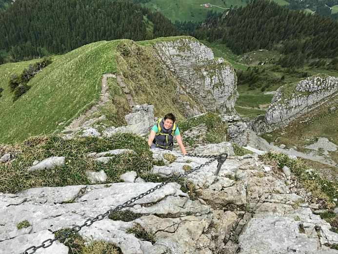 Die Rundsicht und die Tiefblicke, etwa in die Nordflanke, sind gewaltig und suchen ihresgleichen in den Bergen der Voralpen. Der Gratweg, der sich in westlicher Richtung vor dem Anstieg zum Gemsmättli (2.054 m) wenig in einen Sattel absenkt, ist jetzt in seinem Ausbau wesentlich schlichter und zum Teil recht exponiert.