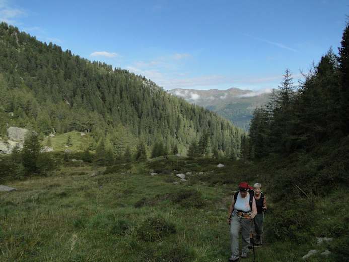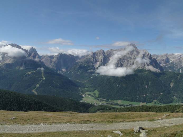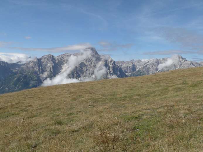 Noch ein Stück durch den Wald aufwärts, dann lichtet sich dieser und gibt den Blick frei. Im Norden öffnet sich das Panorama in die Villgrater Berge. Über die Almflächen geht es aufwärts, bis man den Kamm und damit die Grenze zu Italien erreicht. Man ist überwältigt vom Blick in die Sextner Dolomiten.