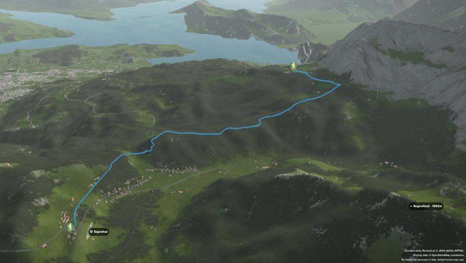 Diese recht gemütliche und landschaftlich reizvolle Abstiegswanderung führt von der Bergstation Fräkmüntegg (1.416 m) vorbei an der Sommerrodelbahn und über das Lauelenegg und den Höchberg (1.198 m) hinab zum Eigenthalerhof.