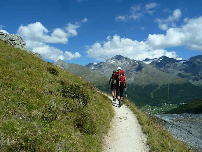 Vom Ortzentrum in Sulden - direkt bei der Kirche St. Gertraud beginnt der Weg Nr. 4. Anfangs führt dieser angenehm schattig durch den Wald aufwärts. Nach einigen Kehren erreicht man die offene Berglandschaft mit alpinen Rasen und Moränenwällen, die die großen, vom Ortlermassiv herabziehenden Gletscher, hinterlassen haben.