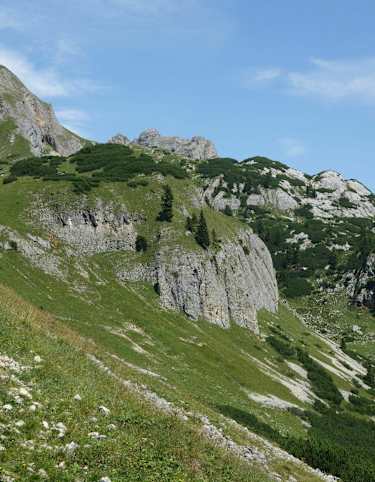 Bei ca. 1.200 m erreicht man eine große Waldlichtung an deren oberen Ende ein Forstweg verläuft. Nach rechts kurz dem Forstweg folgen, dann gleich links in eine grasbewachsene Waldschneise einbiegen. An deren Ende führt ein deutlich sichtbares Steiglein ansteigend direkt Richtung Norden aufwärts erst durch Gebüsch, dann durch lichten Wald bis zum nächsten Forstweg.