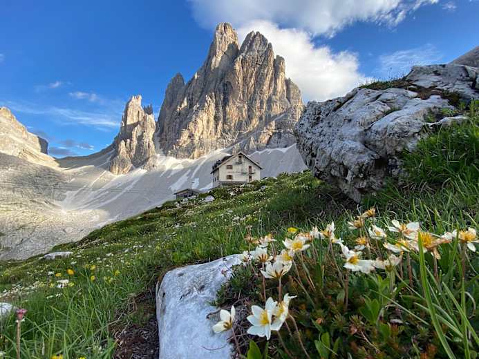 Die Zsigmondyhütte auf 2.224 m steht auf der Schulter des Zwölferkofels mitten im Naturpark Drei Zinnen in den Sextener Dolomiten in Südtirol. Der Anstieg vom Val d'Ansiei von Giralba - unweit von Auronzo di Cadore - führt über die Giralba-Scharte auf 2.434 m.