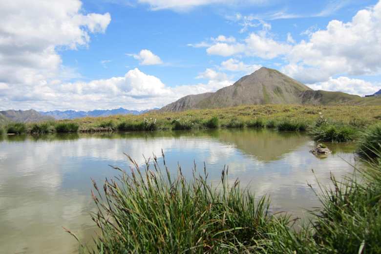 Von der Bergstation Alp Trida Sattel führt der Fahrweg in Richtung Alp Trida bis zum Punkt 2.423. Von hier geht es gerade aus und man quert beide Sesselifte und den Enduro-Downhill-Trail für Mountainbiker. Schon bald führt der Wanderweg am ersten kleinen See vorbei, wo sich bei ruhigen Verhältnissen das Bergpanorama rund um die Alp Trida spiegelt.