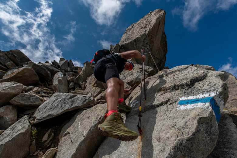 Auf dem Grat, einem echten Panoramagang geht man nun bis zu einer Steilstufe. Über diese gelangt man hinunter in die Elselicka. Auch hier helfen Seile über diese Stelle hinweg. Hier ist es wichtig den weiß-blauen Markierungen zu folgen.