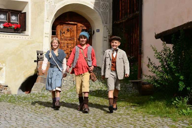 Die drei Hauptdarsteller des Kinofilms "Schellen-Ursli" Foto: Engadiner Post, Marius Lässer, Tourismus Engadin Scuol Samnaun Val Müstair AG