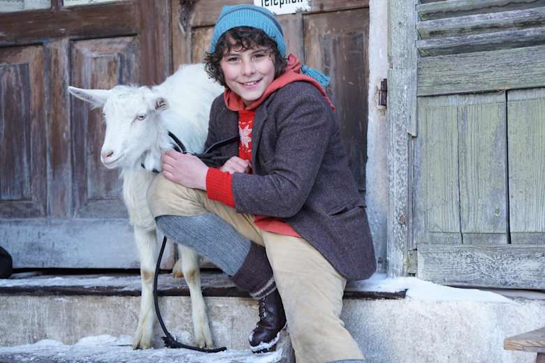 Schellen-Ursli alias Jonas Hartmann während den Dreharbeiten in Sur En d'Ardez Foto: Dominik Täuber, Tourismus Engadin Scuol Samnaun Val Müstair AG