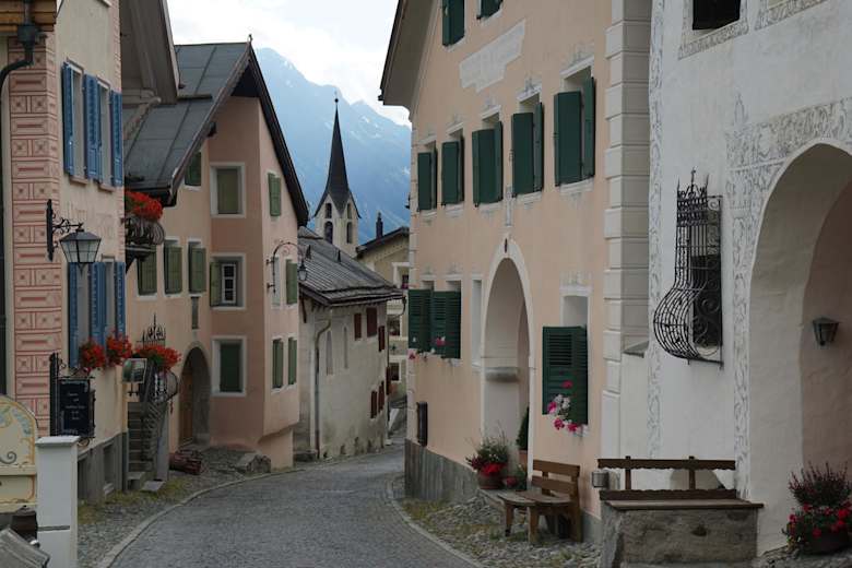 Weiter führt die Tour am westlichen Dorfende abwechslungsreich über Lichtungen und durch Wald bis gegenüber bzw. unterhalb von Giarsun. Man überquert die Brücke und kommt in den Weiler von Guarda, in dem die Kirchenszenen gedreht wurden. Die Kirche ist offen und lädt zur kurzen Rast ein, bevor der letzte steile Anstieg von Giarsun nach Guarda in Angriff genommen wird. Alternativ kann man auch bloss bis zum Bahnhof weitergehen und von dort mit dem Postauto nach Guarda hochfahren.