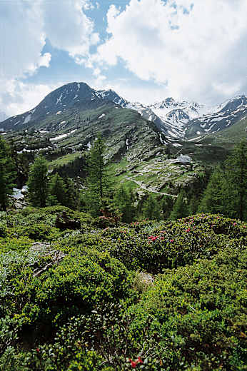 Abzweigungen nach rechts ignoriert man, ebenso den Weg, der nach links wieder zur Zufallhütte hinüberleitet. Durch herrliche lichte Zirben- und Lärchenwälder gelangt man so ins „Paradies“ – so heißt die wirklich paradiesische Landschaft, in der eine weniger paradiesische Hotel-Ruine aus den 1930er-Jahren steht. Gleich nachdem man nach einer Holzbrücke dieses grelle Bauwerk in seiner ganzen „Pracht“ erblickt, zweigt man auf einen kleinen Weg nach links ab und trifft so auf das ehemalige Hotel-Zufahrtssträßchen. Es führt zum Ausgangspunkt zurück, bietet vorher aber noch ein kleines Highlight: die tief unter der Brücke imposant durchrauschende Plima.