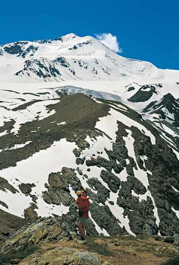 Bei der Marteller Hütte (Variante), die die ganz junge Dame in einer Kraxe erreicht hat. Blick talein auf die Zufallspitzen (3.757 Meter). Foto: Gerhard Hirtlreiter und Eduard Söffker