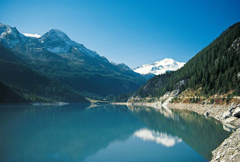 Bild unten: Der zur Energiegewinnung gebaute Zufritt-Stausee im Martelltal, überragt vom höchsten Berg seines Einzugsgebietes: der 3757 Meter hohen Zufallspitze. Von dem Stausee ging 1987 eine Flutkatastrophe aus, nachdem die Betreibergesellschaft dem Staudammwärter verboten hatte, bei starkem Regen und gleichzeitig starker Schnee- und Gletscherschmelze die Schleusen rechtzeitig zu öffnen (die Chefs wollten erst kein Wasser verschenken, dann war es nicht mehr zu beherrschen …). Foto: Gerhard Hirtlreiter und Eduard Söffker