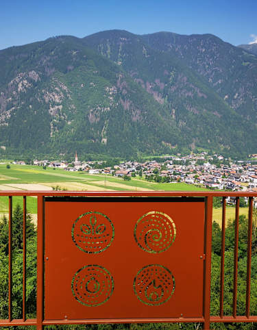 Weiter bachaufwärts kommen wir zu den Terner Mühlen, wo wir uns deren Funktionsweise genauer anschauen können. Wir folgen dem Weg 2 nach rechts über den Bach. Am gegenüberliegenden Hang gehen wir talaus am verlassenen Flitschhof vorbei. Die folgende Abzweigung nach rechts ignorieren wir, passieren eine Liftstation und wandern am Waldrand nach Osten. Nach einem kurzen Stück im Wald kommen wir zum Alpegger Hof. Wenn wir auf die Variante verzichten, nehmen wir dort das schmale Teersträßchen nach rechts hinab. Begleitet von Aussichtsbankerln führt es über eine Wiese und an einigen Häusern vorbei. Gegenüber dem Haus Engl zweigt vor einem Bauernhof rechts ein Feldweg ab, an dem gleich wieder eine Bank steht; am Baum dahinter bestätigt eine schwache rot-weiße Markierung, dass wir hier richtig sind. Der Weg führt durch eine Wiese in den östlichen Ortsteil von Terenten, durch den wir schräg hinunter zur Hauptstraße gelangen. Nach dem Feuerwehrgebäude leitet ein Zebrastreifen hinüber zum großen Parkplatz in Terenten.