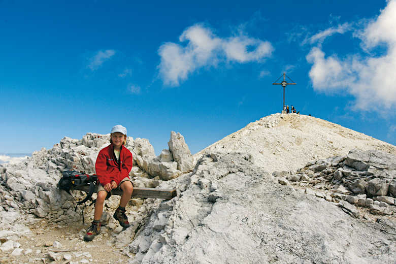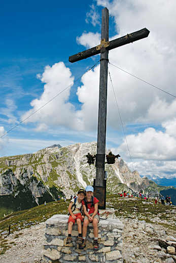 Besteigung des Dürrenstein (2.838 m, beschildert, ab Parkplatz Aufstieg 2:45 Std., Abstieg 1:45 Std., 870 m Höhenunterschied, ab 8 Jahren). Unverfehlbarer Bergweg ohne Abzweigungen, bis zum Vorgipfel ohne Schwierigkeiten oder Gefahrenstellen; zum Vorgipfel mittelschwer („rot“), am Übergang zum Hauptgipfel gibt es eine etwas exponierte Kraxeleinlage mit Stahlseil (eine eindeutig „schwarze“ Stelle, an der es nicht schaden kann, wenn erfahrene Eltern ihre Kinder etwas unterstützen).