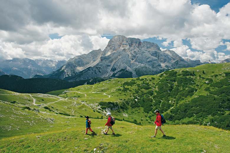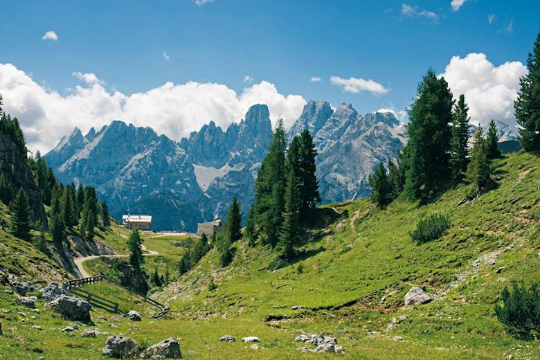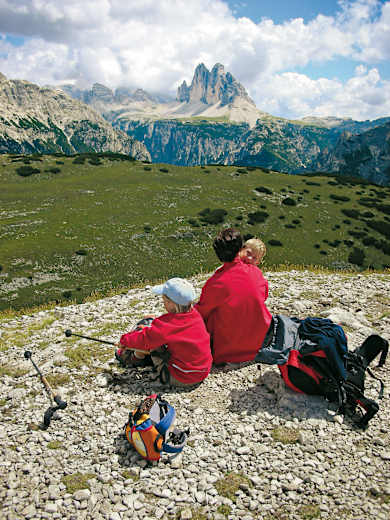 Oben, beim 1981 aufgestellten Heimkehrerkreuz, am 2.307 Meter hohen Strudelkopf, empfängt Wanderer dann eine grandiose Aussicht auf die Drei Zinnen.