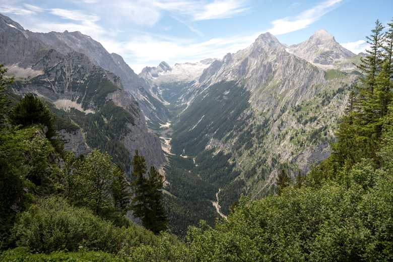 An der nächsten Weggabelung, gleich nach der Brücke über den Oberen Reintalbach, hält man sich gerade aus, überquert bei der Diensthütte noch einen Bach und kurz vor der Bockhütte, auf der man gemütlich einkehren kann, gleich noch einmal die Partnach. Hier befindet man sich nun am E4 und der Via Alpina und wird diesen beiden europäischen Weitwanderwegen bis zur Reintalangerhütte folgen.