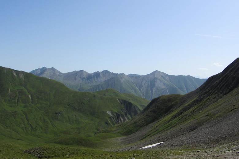 Beim Spatlasattel wechselt wiederum das Panorama, diesmal sieht man gegen Westen die Schweizer Seite der Silvretta Arena, den Samnauner Hausberg Muttler und das Fluchthorn.