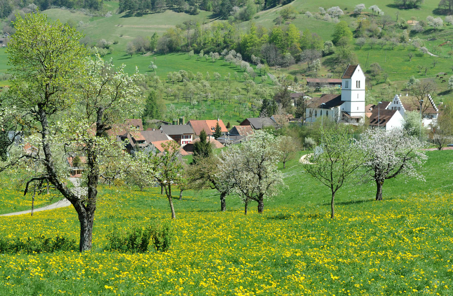 Von Anwil wandert man westwärts über einen Pfad im Wald zum Talweiher, wo man später entlang vom Bach im schattigen Wald Richtung Oltingen geht. Das schmucke Dörfchen mit der weißen fotogenen Kirche, welche besonders im Frühling zur Obstblüte mit der Landschaft perfekt harmoniert, ist einen kleinen Rundgang wert.