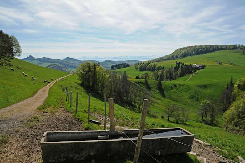 Beginnend in Langenbruck folgt man der Straße zum Ober Hauenstein und biegt nachher westwärts ins Tal der Vorderen Frenke. Über den Graben Helfenbergrüttenen wandert man weiter entlang vom Südhang des Helfenberges bis man an der Lichtung des Hinterhaubergs bei Ischlag (1.062 m) in Vorderi Egg ankommt. Hier kann man eine kurze Abzweigung zum Chellenchöpfli (1.157 m) machen und feine Aussicht auf die Jurahügeln genießen.
