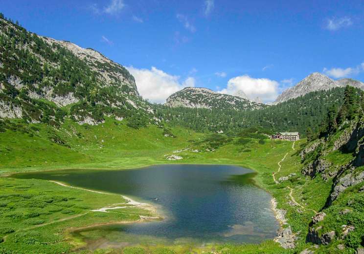 Für den Zustieg aus dem Wimbachtal zum Kärlingerhaus (1.631 m) in den Berchtesgadener Alpen, das der DAV Sektion Berchtesgaden gehört, nimmt man sich etwas länger Zeit. Großartig gelegen ist die Hütte mit seinem kleinen See am Rande des Steinernen Meeres.