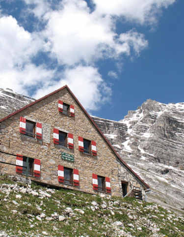 Man erreicht den Abzweig zur Müllerhütte, den man ignoriert und nach rechts über versicherte Felsen zur aussichtsreich gelegenen Hütte aufsteigt.