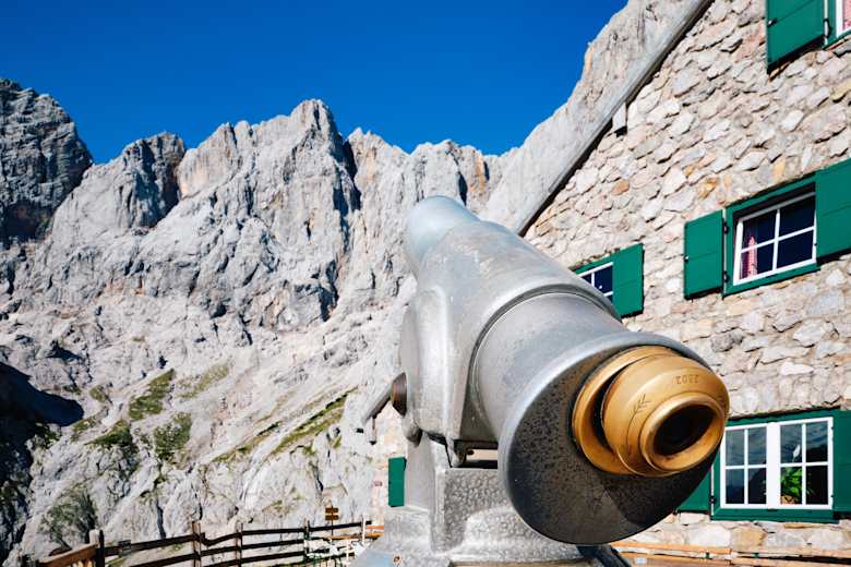 Das Fernrohr der Dachstein-Südwand-Hütte ist auf die Südwand gerichtet. Foto: Armin Walcher / Red Bull Media House Publishing