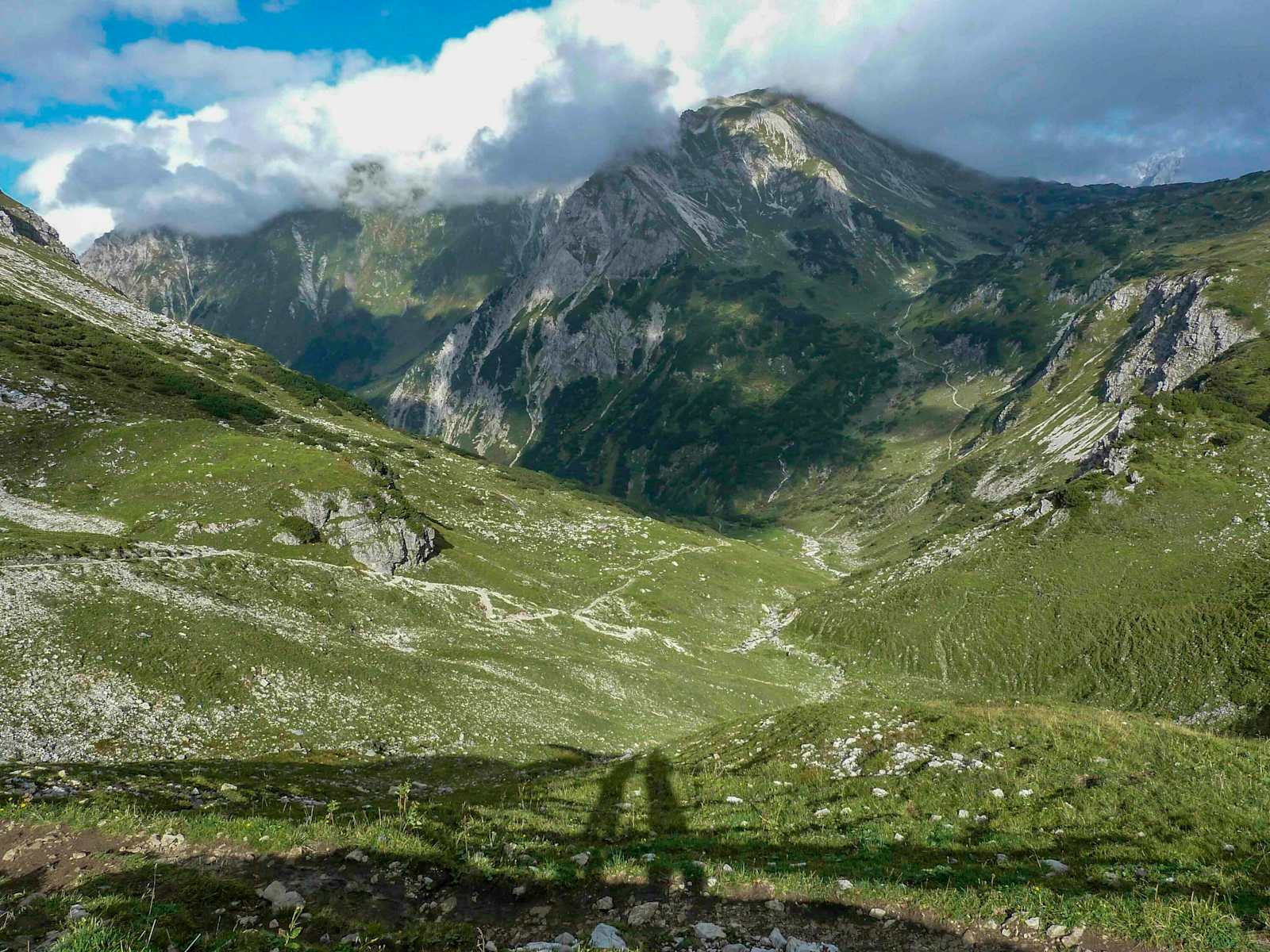 Der Steig nimmt den Wanderer nun mit unter dem Geißhorn hindurch und verliert zum Wildengund an Höhe. Hier sieht man bereits die Mindelheimer Hütte (2.013 m), zu der man absteigt.