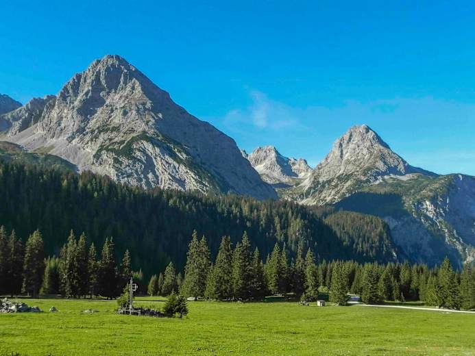 Hier wechselt man nicht nur das Land, sondern steigt auch hinüber zum Zugspitzplatt. Auf- und absteigend quert man hinüber zur Knorrhütte (2.052 m).