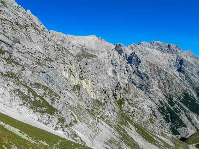 Von der Talstation der Ehrwalder Almbahn wandert man entlang der Skipiste auf breitem Weg zur Ganghofer Hütte und weiter zur Bergstation an der Ehrwalder Alm (1.502 m). Auf dem Schotterweg geht man noch ein Stück taleinwärts, ignoriert dabei den Abzweig zum Seebensee und gelangt zu einer Pestkapelle. Hier zweigt man nach links ab und erreicht wenig später die Hochfeldernalm. Dahinter wird aus dem breiten Schotterweg nun ein Steig, der unterhalb der steilen Südwände des Wettersteinkammes nach schräg rechts aufwärts zieht. Man erreicht den Punkt „Am Brand" (2.110 m), von dem man eine wunderbare Aussicht auf die südlich aufragende Mieminger Kette erhält. Absteigend quert man hinüber ins Feldernjöchl (2.045 m) zu einer Wegverzweigung. Man folgt dem geradeaus führenden Steig, der teilweise versichert in den Einschnitt des Gatterls (2.024 m) führt.