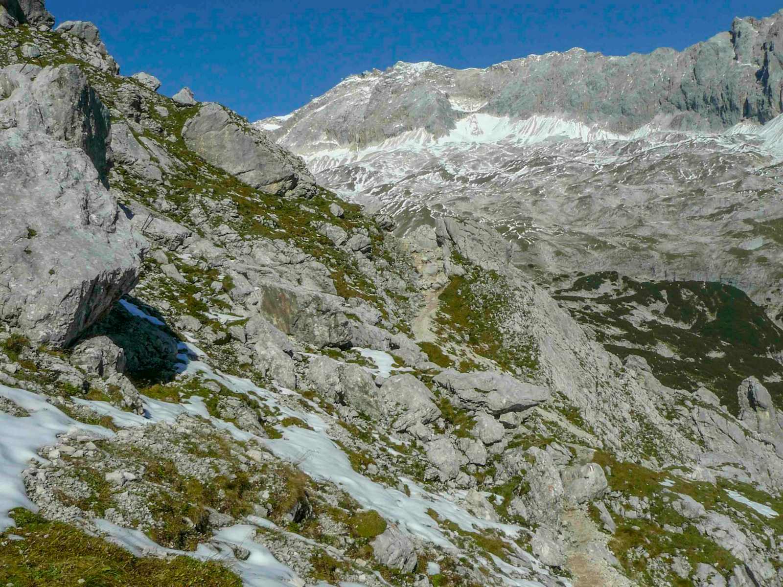 Vom Joch wandert man leicht abwärts bis zum Feldernjöchl (2.045 m). Hier kommt der Weg von Ehrwald herauf. Man hält sich rechts und wandert hinüber zum Gatterl (2.024 m).