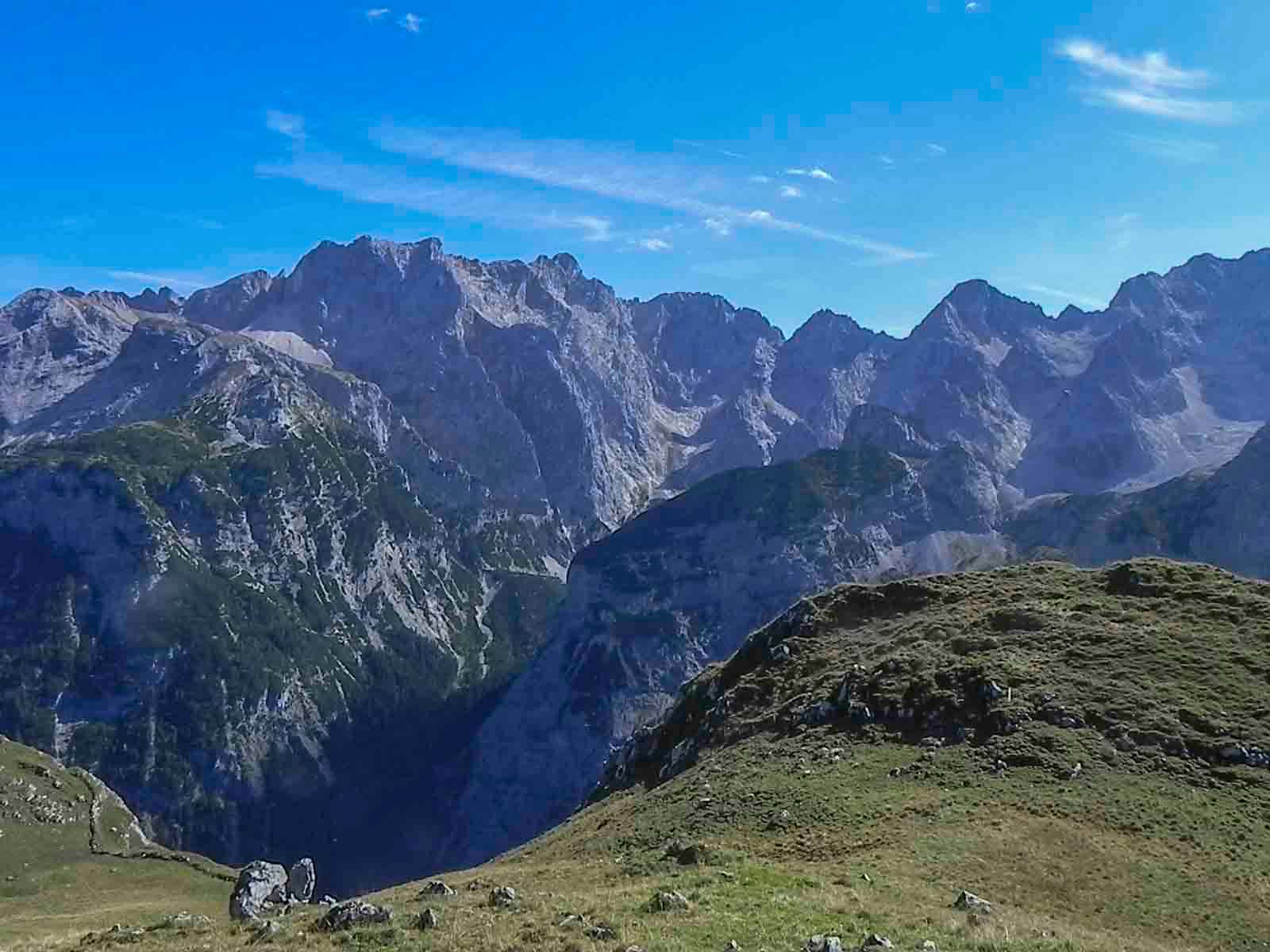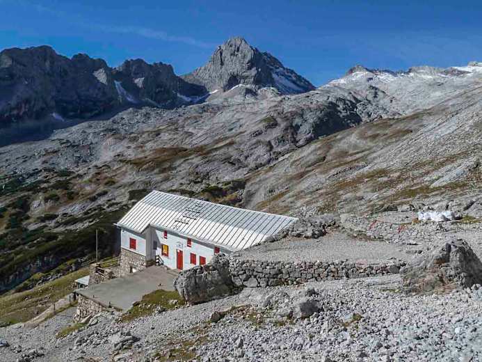 Die Knorrhütte (2.052 m) auf der bayerischen Seite des Wettersteingebirges steht am Rande der kargen Fläche des Zugspitzplattes. Ein eher ungewöhnlicher, aber sehr schöner und spannender Zugang führt von Garmisch-Partenkirchen über das Kreuzeck und den Schützensteig zur Hütte.