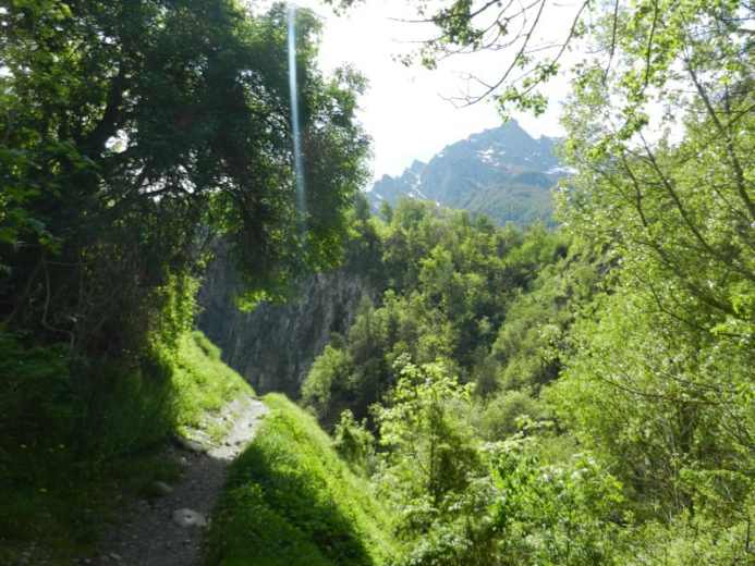 Der dann folgende steile Aufstieg nach Ried-Brig (927 m), hinauf zu den „Bleiken“, bleibt das anstrengendste Stück der Wanderung. Dort angekommen geht es auf dem Hochplateau mit Blick über das Rhonetal Richtung Dorf. Man kommt vorbei am alten Dorfkern und biegt beim Hotel Simplon in Ried-Brig in die Strasse zum „Bachi“ ein. Dem Namen entsprechend, führt ein schöner Fahrweg entlang eines kleinen Baches durch Wald und Wiesen.