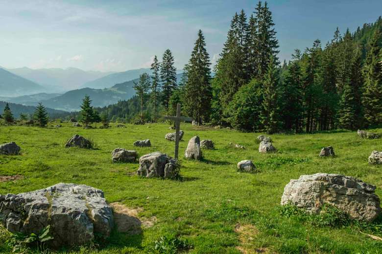 Man wandert auf dem Forstweg noch ein kurzes Stück aufwärts und nimmt dann einen Steig, der zu einer Lichtung mit einem Kreuz führt. Den folgenden Abzweig zur Wochenbrunner Alm ignoriert man und wandert auf dem Höhenweg nach Osten. Dabei überquert man den Weg 825 zur Gruttenhütte (1.620 m).