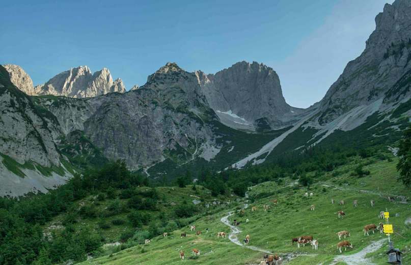 Hier zweigt nach links ein Wanderweg ab, der hinauf zur Wochenbrunner Alm führt. Von der Alm wandert man auf dem breiten Schotterweg hinauf zur Gaudeamushütte (1.267 m).