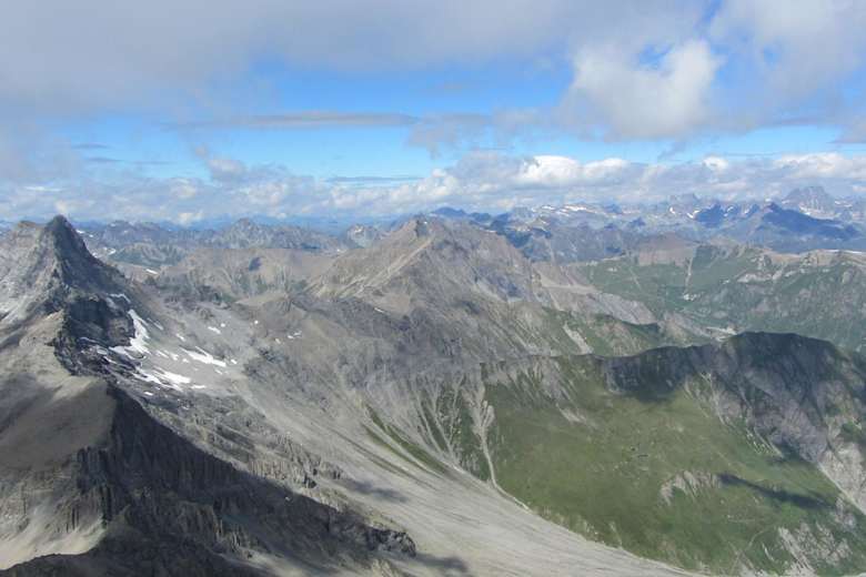 Das Gipfelpanorama entschädigt die Anstrengung und reicht über die Silvretta-, Bernina- und Verwallgruppe im Westen und Norden, die Ötztaler Alpen und den Ortler im Osten und Süden. Bei klarer Sicht ist der Bodensee zu sehen.