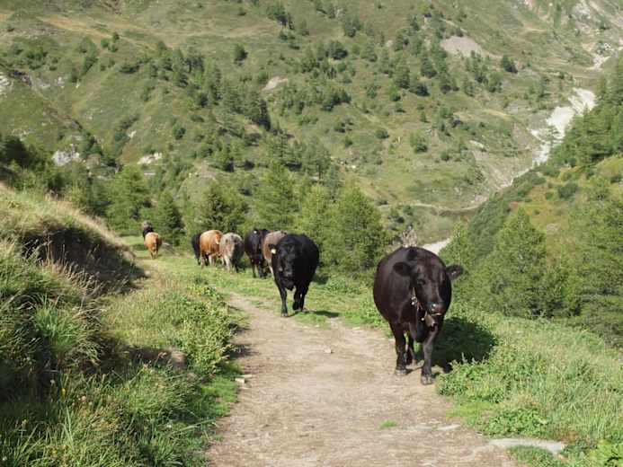 Ausgeruht kann nun der Abstieg erfolgen. Die Route führt das Saflischtal hinaus bis zum Wasserspeicher oberhalb von Fleschboden. Dort kann man sich verpflegen und auch feine Walliser-Spezialitäten genießen. Ab hier dauert der Abstieg noch etwa 40 Minuten bis nach Rosswald (1.800 m). In Rosswald kann man erneut einkehren oder auch übernachten. Der Alpenpässeweg führt am nächsten Tag weiter Richtung Simplon und Saas Tal.