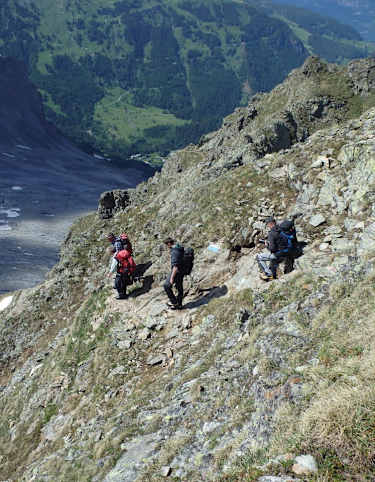 Zurück in der Furgge folgt man in deutlich weniger steilem Gelände dem markierten Pfad abwärts bis auf ca. 1.800 m, wo dieser unvermittelt nach links wegknickt (Eberesche etwas unterhalb des Punktes). Man wendet sich markant an Höhe, bis er am Rand einer Geröllhalde auf einen Pfad stößt, der mit scharfem Linksknick zur Fluonalp führt. Beim Knick hält man sich rechts und steigt in der Nähe des Weidezauns weglos über blumenreiche Wiesen am Fuß der Rossflue auf. Ein Blick zurück zeigt den Sarnersee aus ungewohnter Perspektive.