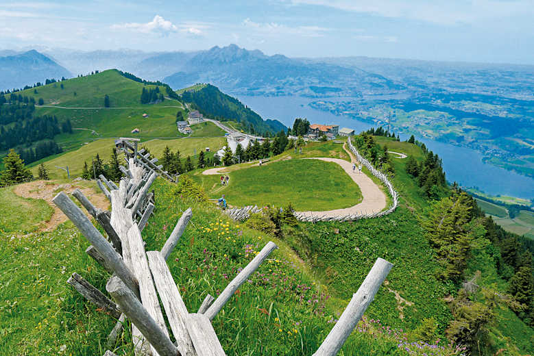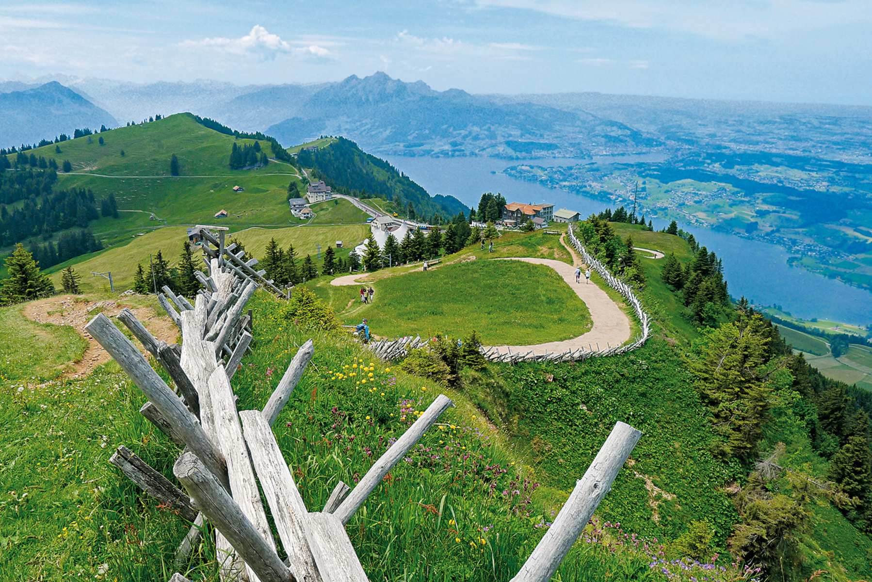 Der Schlussanstieg zum eigentlichen Rigi Kulm, 1.798 m, dauert nur noch ein paar Minuten. Oben angelangt, lohnt sich eine längere Gipfelrast, denn die exponierte Lage garantiert ein perfektes 360-Grad-Panorama. Verständlich, dass sich bei schönem Wetter täglich Tausende auf den Berg begeben, um den Blick über die Zentralschweiz und darüber hinaus zu genießen.