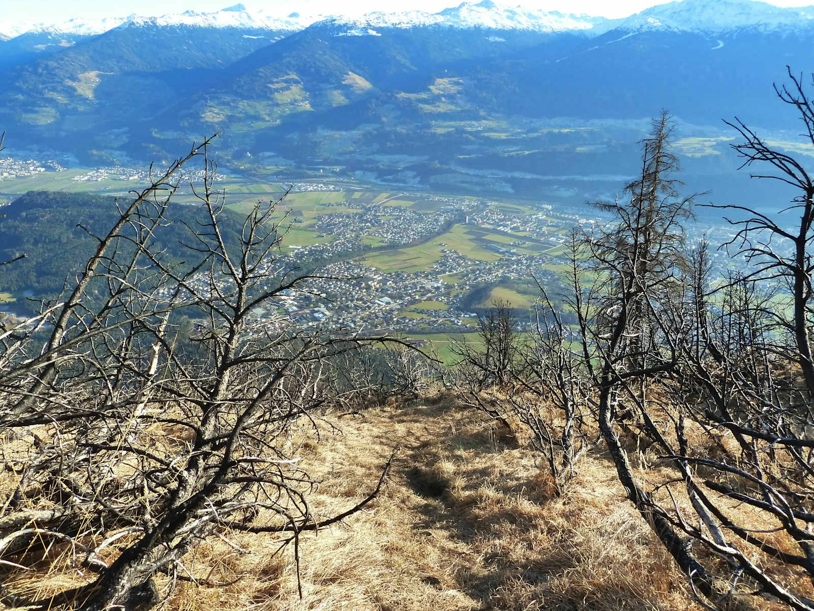 Vom Hochmahdkopf geht es steil bergan ins Halltal. Ein Brand hat hier vor einigen Jahren die Vegetation des gesamten Hangrückens vernichtet. Noch heute sind die schwarz in den Himmel ragenden Rest der Latschen zu sehen - ein seltsam anmutender Anblick. Gleichzeitig aber auch ein Mahnmal, dass vor allem Frühling, wenn wenig Niederschlag fällt, absolut kein offenes Feuer (gilt auch für Zigaretten) an den Trockenhängen entzündet werden darf. Hinweisschilder geben Auskunft über den damaligen Brand und den enormen Feuerwehreinsatz.