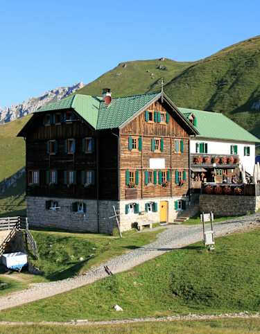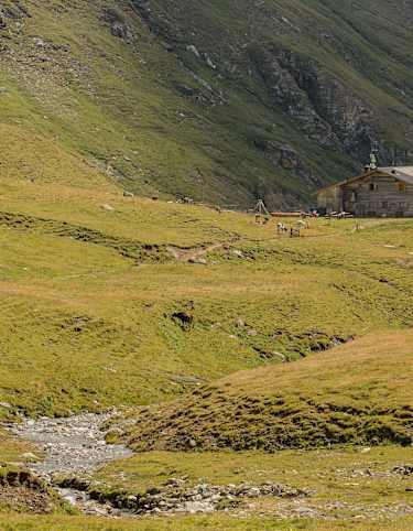 Von der Scharte wandert man über die Wiesen der Stevia-Hochfläche zur nahen Steviahütte (2.312 m).
