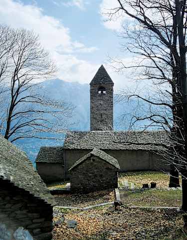 Die ersten alten Steinhäuser stehen auf der Alm Puntid. Etwas weiter dem Weg entlang, nachdem eine elegante Hängebrücke passiert wurde, beeindruckt das Maiensäss Gerra (1.040 m) mit seinen riesigen Felsen. Hier haben Menschen höhlenähnliche Behausungen gegraben, um in der Kühle Schutz zu finden. In den Wintermonaten erreicht die Sonne diese abgelegenen Stellen kaum.