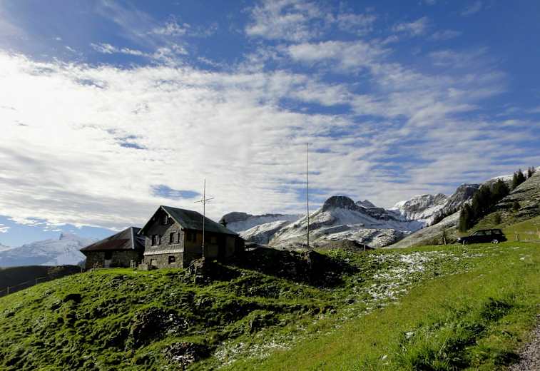 Auf dem vorerst wenig steilen Bergwanderweg nach Balm, kann man hervorragend den Hahnen und die beiden Spannorte bewundern. Der Abstieg zur Hüethütte wird nun etwas steiler, doch problemlos.