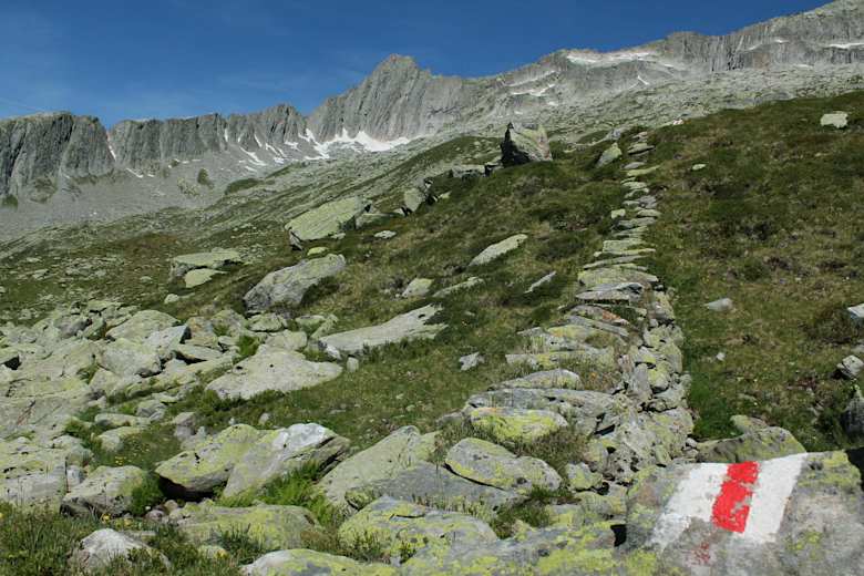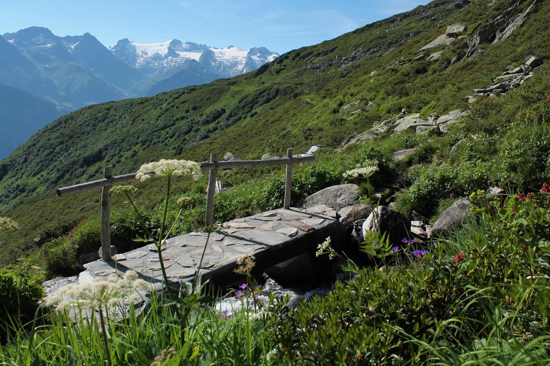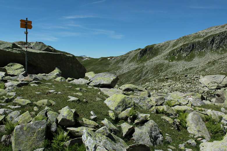 Bis Foppa ist aber dennoch konzentriertes Gehen angesagt, erst weiter unten führt der Weg wieder über sanfte Alpweiden. Durch das Val Lumpegna geht es immer weiter herab, den Wegweisern über die Alp Lumpegna folgend bis zum Val Sogn Placi.