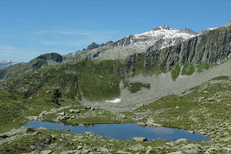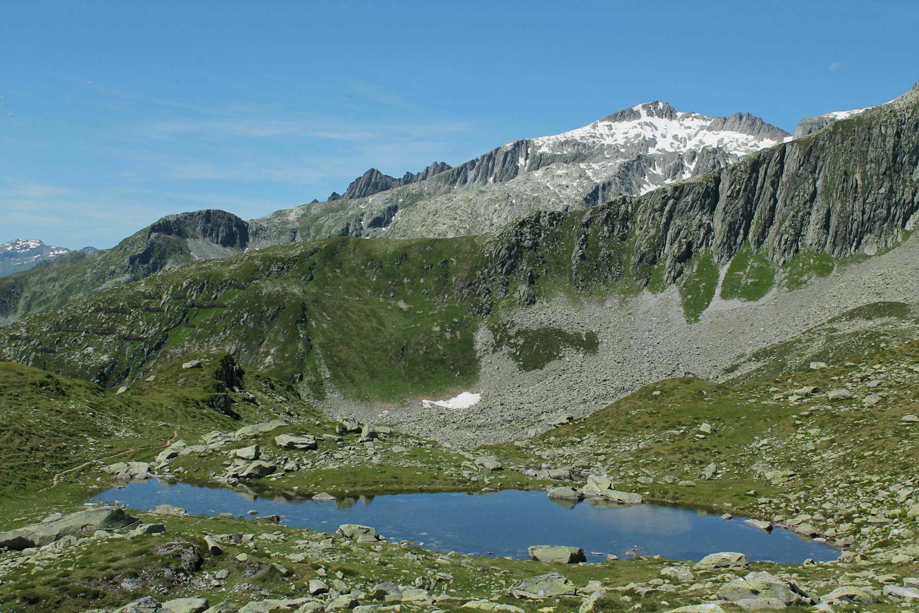 Über Alpweiden führt der Weg sanft ansteigend zum etwas grösseren Lag Brit. Im Norden durch Piz Run und Piz Lumpegna begrenzt, eröffnet sich hier Richtung Süden ein beeindruckender Ausblick, u. a. auf den Piz Medel.
