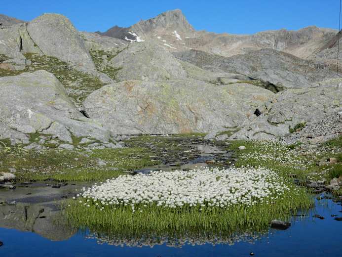 Schneefelder und Blumenpolster bereichern die an sich karge Landschaft um den meandernden Bach. Am westlichen Rand führt ein spärlich markierter Weg über Geröll und Felsblöcke herauf Richtung Pass. Man gewinnt zunehmend an Höhe, wobei man vermehrt schönste Blumenpolster bewundern kann.