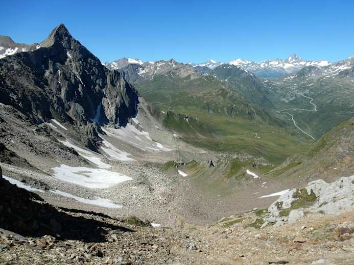 Nach etwas coupiertem Felsgelände öffnet sich dann der Blick zum finalen Anstieg in einer steilen, rutschigen Halde. Ist dieser bewältigt und der Pass erreicht, eröffnet sich ein wunderschöner Weitblick zum Nufenenpass und zum Alpenhauptkamm mit Aletsch-, Gross Wannen- und Finsteraarhorn.