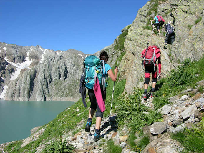 Steil herab geht es die letzten paar Höhenmeter über eine letzte Felspassage zum Lago dei Cavagnöö und weiter über die abschüssige, seilgesicherte Staumauer Cavagnoli.