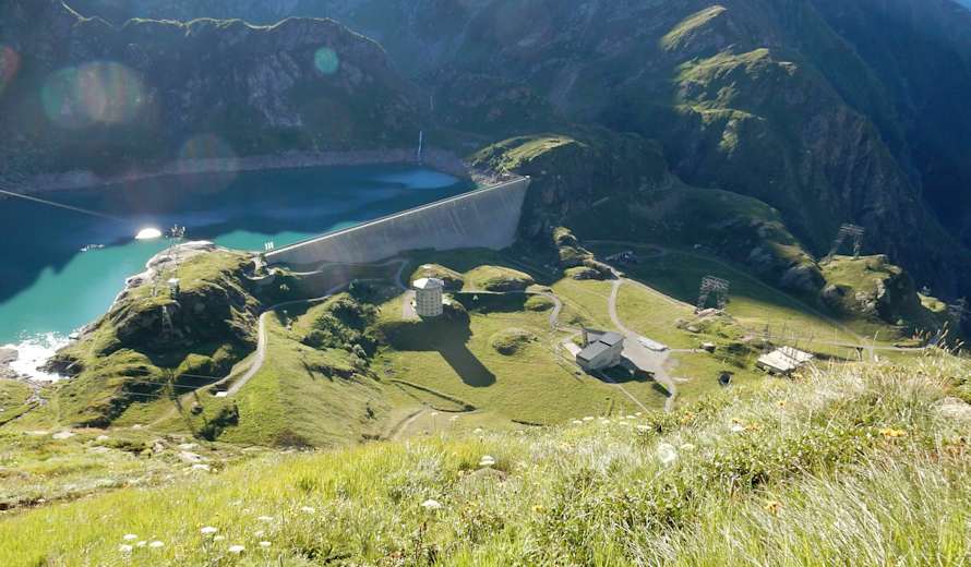 Entlang dem sanften Kamm steigt man nun auf dem gut markierten Weg einige Höhemeter ab, bis man an einem verlassenen Bauwerk den Abzweig hinunter zum Staudamm des Lago dei Cavagnöö erreicht (nicht wie auf der LK eingezeichnet weiter östlich, sondern direkt inmitten der Betonmauer des erwähnten Werkes auf 2.366 m).