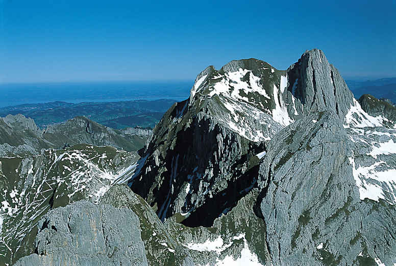 Eisenstifte und Drahtseilgeländer helfen über das speckig gewordene Kalkgestein empor zur Felsentreppe und zum Stollen unter den Gipfelbauten des Säntis (2.502 m). Er präsentiert das Paradebeispiel eines total erschlossenen Gipfels. Der ersten Unterkunft 1846 folgte 1882 die Wetterstation. 1935 ergriff dann die Luftseilbahn von der Schwägalp vom Gipfel Besitz und seit 1999 krönt der riesige Telekommunikationsturm als weithin sichtbares Wahrzeichen den Säntis. Bei aller technischen Erschließung hat die faszinierende Rundsicht nichts von ihrem Zauber eingebüßt. In alle fünf Nachbarländer reicht der Ausblick vom König der Ostschweizer Berge! Wer die Namen der vielen Gipfel entschlüsseln will, greife zur detailgenauen Panoramazeichnung von Albert Heim.