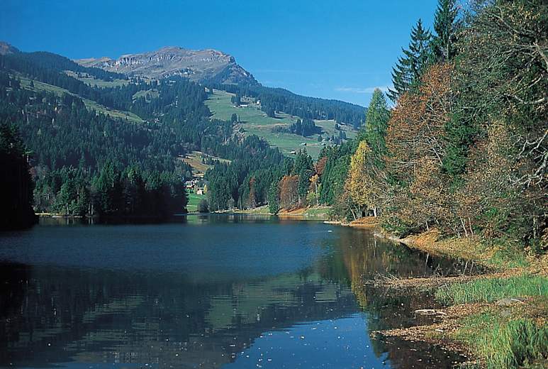 Ein Steinmauerweg leitet jetzt hinunter zur Alp Mädems-Hintersäss (1.776 m). Von hier aus folgt man dem Fahrsträßchen zur Alp Mädems-Vorsäss, dann steuert man über Weidegelände abwärts die Brücke über den Cholschlager Bach an und biegt schließlich rechts ab zum nahen Chapfensee (1.030 m). Hübsch spiegelt sich der breitschultrige Guscha im klaren Wasser.
