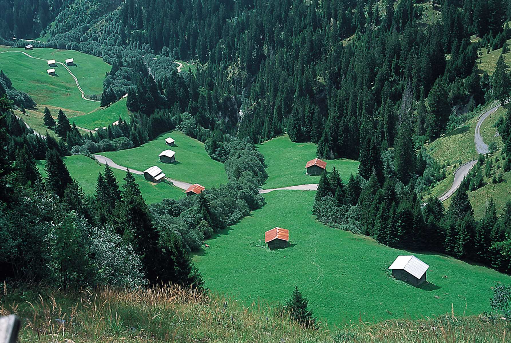 Nach einem Felsband geht es über die erste, grasige Geländestufe zu den Hütten der Oberstafel (1.675 m). Auf der linken Seite ragt eine der höchsten Kletterwände der Ostschweiz – die Vorab-Westwand – gegen den Himmel. Verschiedene Wasserfälle unterbrechen die Ruhe der Alpenwelt.